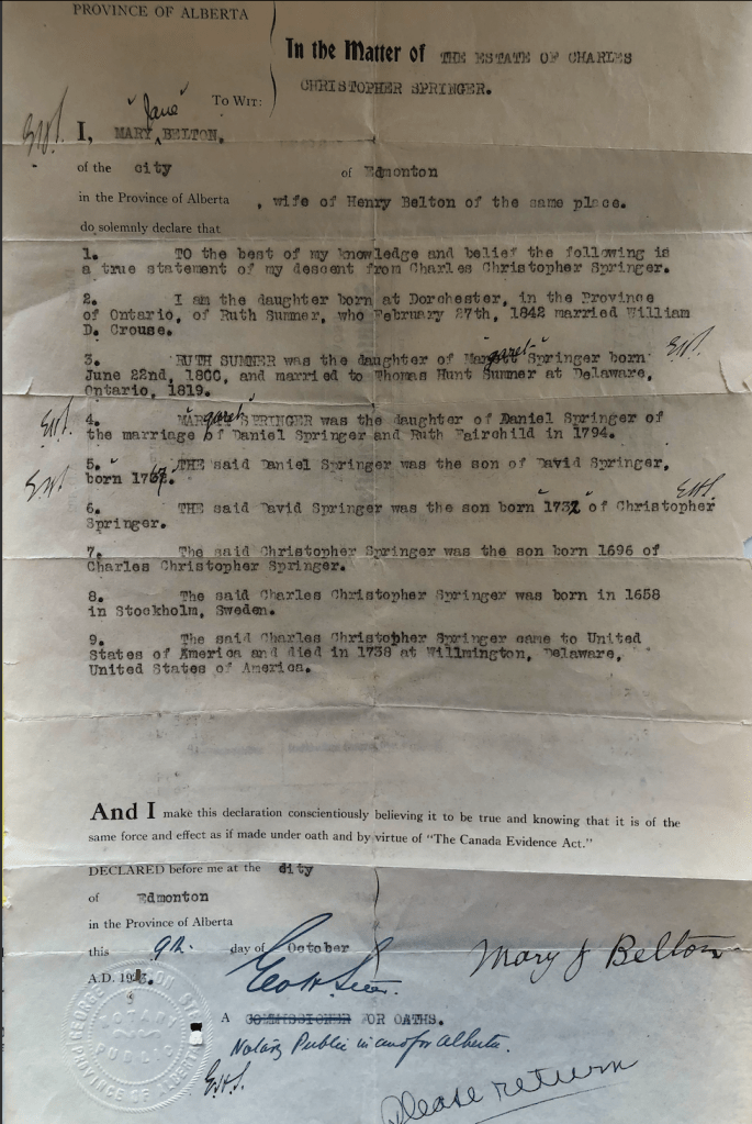 This Statutory Declaration drawn up for Mary Jane Belton, my grandfather’s maternal grandmother, in response to what turned out to be the Springer Heirs hoax,  provided the impetus I needed to shed light on our family story. For a while I was the proverbial sleuth, working with professional genealogists and doing my own personal research to gather as many resources as I could. I also widened the search to include other lineages. The whole experience was exhilarating and I became eager to learn about the times and places in which my ancestors lived so I might get to know them. I imagined the strength, resilience and ingenuity it would have taken to survive, never mind thrive, under difficult and ofttimes perilous circumstances. Strange as it may sound I felt the more I got to know them the more I understood myself, for their blood and DNA ran in my veins. I am not here without them.