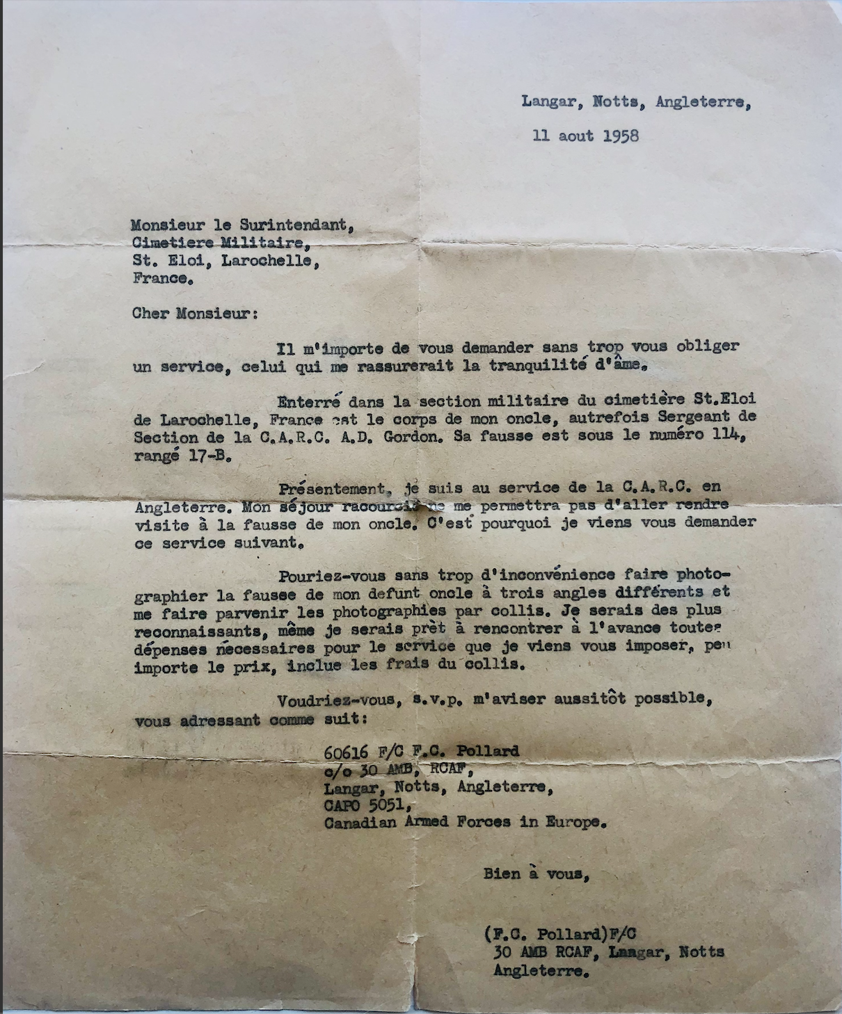 Archie was laid to rest twice ~ first at the civilian cemetery St. Eloi in La Rochelle, France, and later in the Pornic War Cemetery, Loire-Atlantique. In the following collection of images we see the first letter written in early 1958 by a close family friend (my mother’s boyfriend at the time) identifying Archie as his uncle. In the letter he asks for photographs of the grave from three different angles to provide some peace of mind for the family. The handwritten response tells that Archie’s body was transferred to the Pornic War Cemetery in February 1953. The first photo is the young airman’s marker in La Rochelle, the second marks where his body is laid to rest in Pornic.