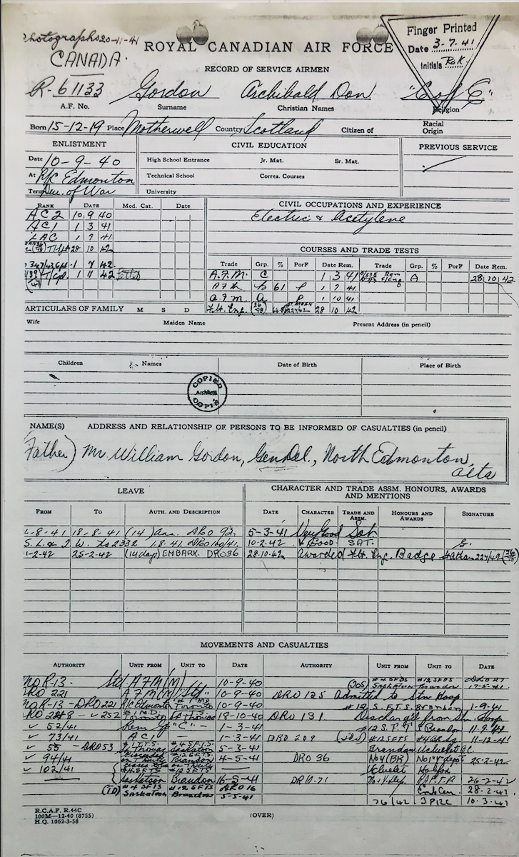 Following in the tradition of his father, Sergeant Major William Alexander Gordon who served in the Black Watch all through WWI, and his maternal grandfather, Major Edward Robson, who served in India in the late 1800s, young Archie volunteered for military service at the beginning of WWII, opting for the Royal Canadian Air Force (RCAF). His Attestation Paper provides some insight into his life at that time: