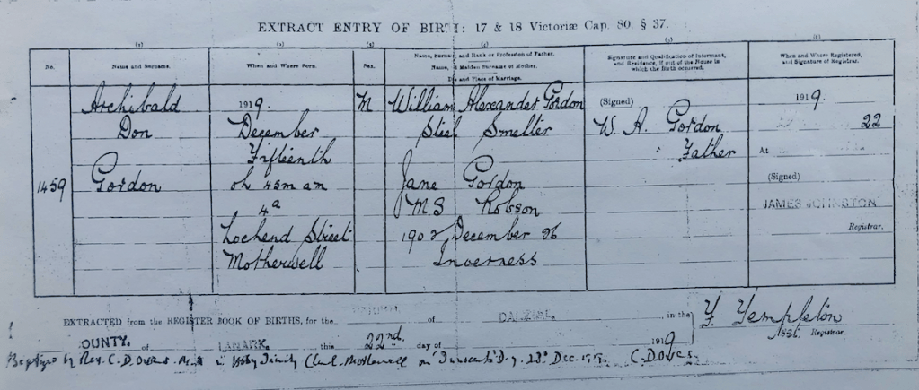Archie ~ Our dear brother. There was something about him from the time he was born. My mother always said it. He was born the 15th December, 1919. The first after dad’s return from the war. He was named for (or after) a superior officer of my dad’s after dad wrote to the family in England and asked permission to do so. The officer’s name was Archibald Don. He was killed. So my brother became Archibald Don Gordon. He was an easy one to raise yet he liked to get into mischief with the other boys. One time he and two pals stuffed a mean old bachelor’s chimney with straw and stuff so that the smoke could not get out. The police came out. The RCMP, but when they saw this small red headed kid they did nothing about it. I cannot go into Archie’s life fully. We all loved him and still do. (I think I’ll come back to this another day.)