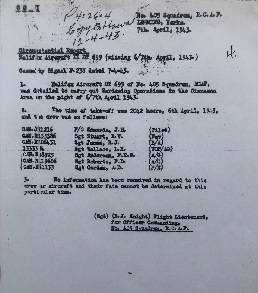 And then, on April 6, 1943, less than a year after taking to the air, the unthinkable happened ~ his Halifax Bomber was shot down. The crew were missing in action. The following Circumstantial Report outlines details: