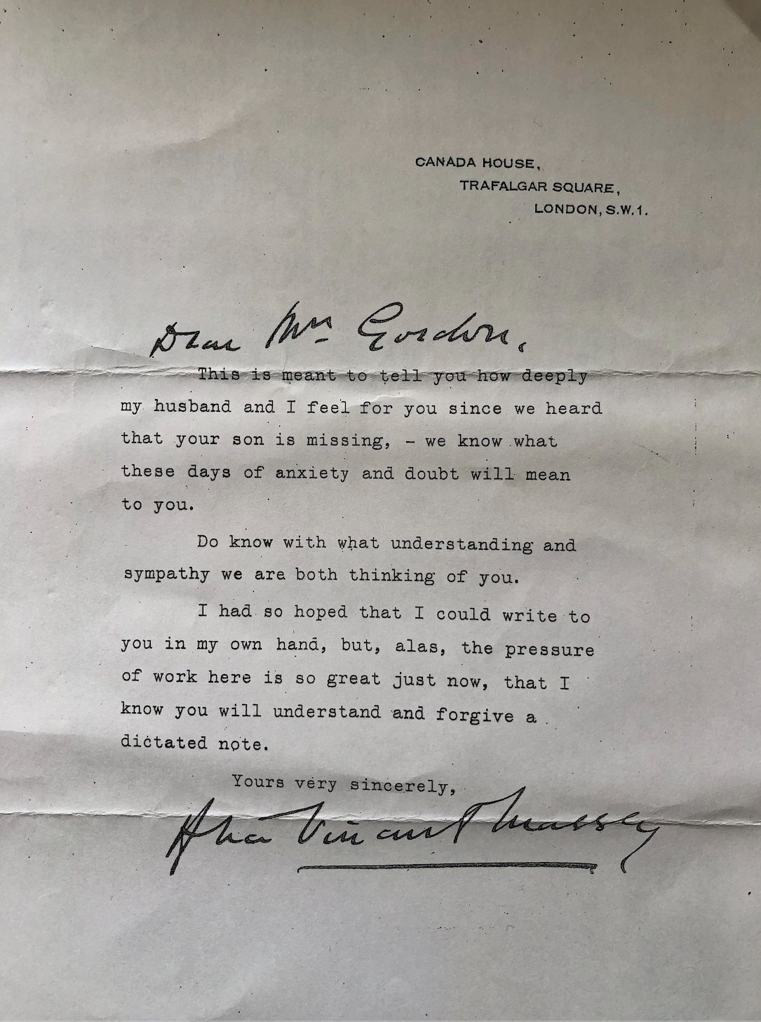 The impact of Archie’s disappearance was felt beyond the family. When his eldest sister, Jean, first came to Canada in the early 1920s she landed in Toronto and worked as a maid in the household of one of the wealthiest and most influential Canadian families of the early 20th century, Vincent and Alice Massey. Upon hearing the news of Jean’s brother’s disappearance Mrs. Massey, who was in London with her husband the High Commissioner to Britain during the war years, sent a letter to their mother, offering her sympathies: