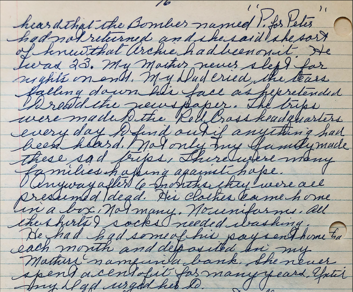 “My mother was alone when the telegram arrived. She ran to a neighbour who got to my dad at his work. That was a dark day. My mother couldn’t eat or drink anything fearing that Archie was a war prisoner or that he had no food or water. I cannot tell all details here about the agony of it. My mother had been listening the night before to the news on the radio that told of results of raids and which planes had not come back to England. She heard that the Bomber named “P. for Peter” had not returned and she said she sort of knew that Archie had been on it. He was 23. My mother never slept for nights on end. My dad cried, the tears fell down his face as he pretended to read the newspaper. The trips were made to the Red Cross headquarters every day to find out if anything had been heard. Not only my family made these sad trips. There were many families hoping against hope.