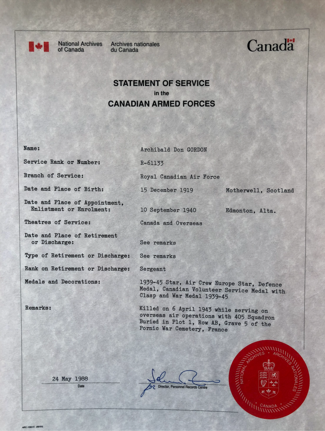 Sergeant Archibald Don Gordon was later confirmed dead. His body and those of his fellow crew members washed ashore in the area where their plane had been shot down over the Bay of Biscay off the coast of France.