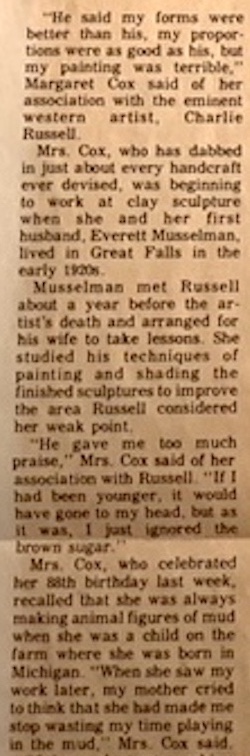 Paying tribute now to my great grandaunt Margaret (Belton) Musselman Cox (1887-1978) who was a multi-talented creative. In an excerpt from this circa 1975 article in an unidentified Montana newspaper we read the following: