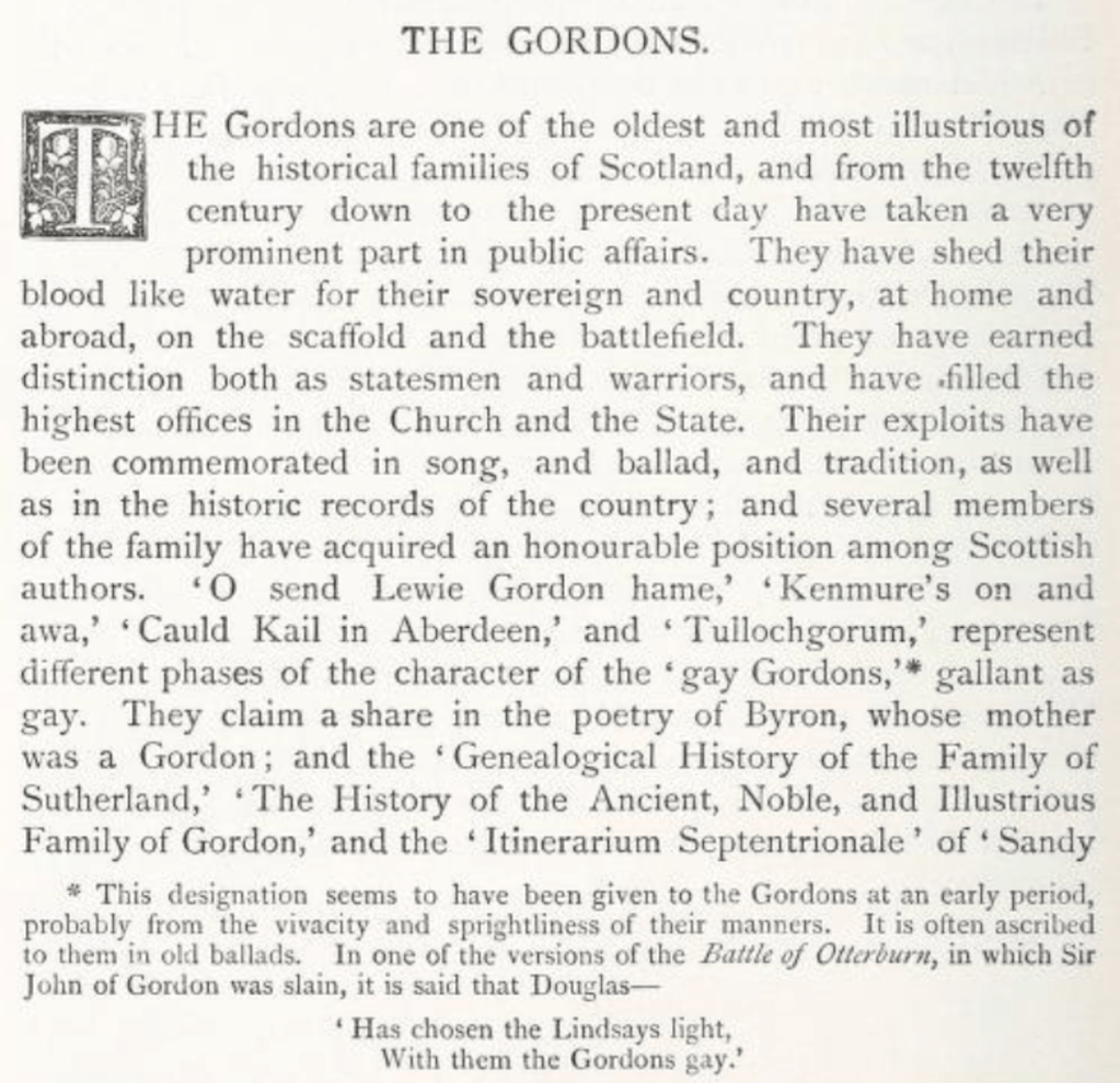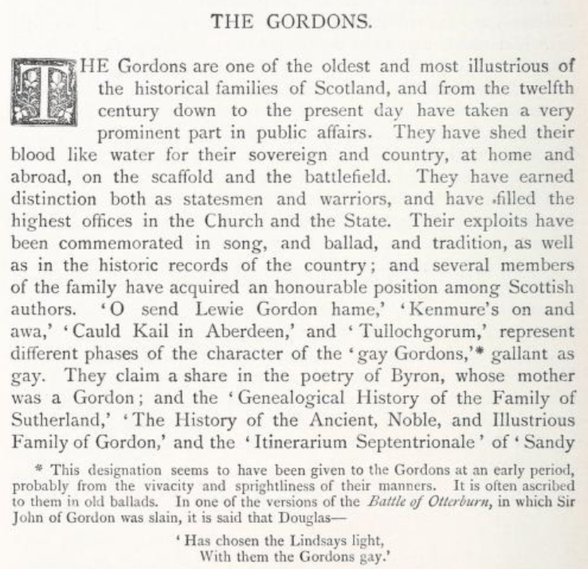 The Great Historic Families of Scotland by James Taylor (1813-1892) published in 1889 and contributed to Internet Archive by the Kelly Library, University of Toronto … includes an entire section on the history of Clan Gordon. The spirit of my Scottish great grandfather, William Alexander Gordon (1880-1954), exemplified the “vivacity and sprightliness of their manners,” even after having served at Gallipoli during WWI. He was known for his good humour, generous heart, and enduring work ethic while pioneering in the wilds of northern Alberta well into his 50s. This printed history, now available online, helps to bring context to my understanding of the Gordon lineage, something I really appreciate.