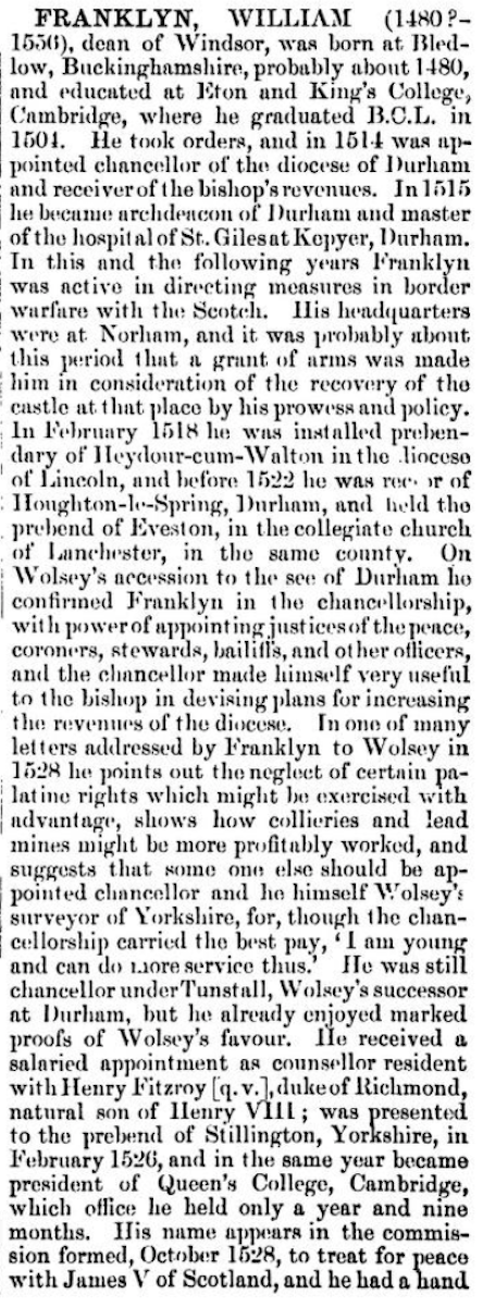 Working with the tree at FamilySearch I traced the well-documented Sumner family line to Roger Sumner of Bicester, Oxfordshire (1578-1608) and his wife, Joane Franklin (1560-1620), my 11th great grandparents. Curious about the Franklin line I noticed they are traceable back a further five generations to Robert Franklin (1415-1492) and his wife, Ann Offord (ca1429-ca1492) both born in Skipton, Yorkshire; both died in Norfolk, England. They had four children. Their youngest son and fourth child, William Franklin (1460-1556) was born in Bledlow, Buckinghamshire. He married Margaret Ann Risby (1455-1543) in 1489 at Ravensden, Bedfordshire, and went on to become the Dean of Windsor, as per the following: