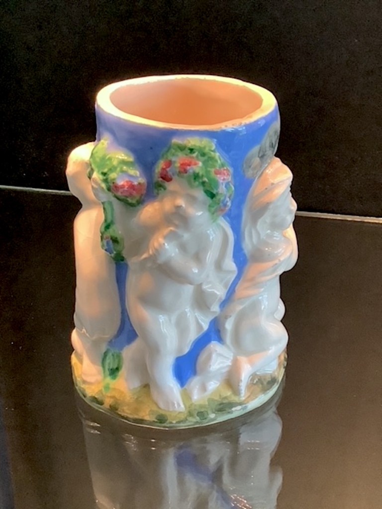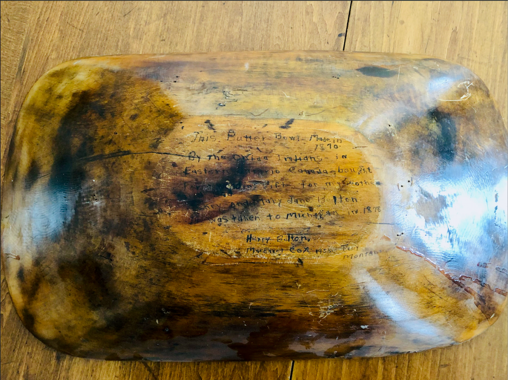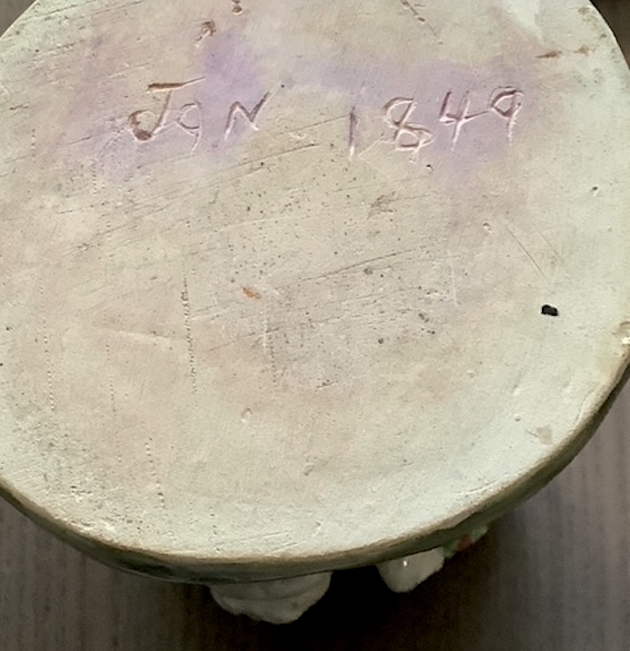 The second item is a glazed, blue ceramic vase ornamented with cherubic figures all the way around. It has an inscription on the bottom noting the date it was produced, and that’s all we know except that it has been in the family for generations. Sadly, great aunt Margaret didn’t think to label it. In 1849 the Beltons and Crouses resided in Delaware, Ontario. Was it a wedding gift? A token of love or appreciation? We’ll never know.