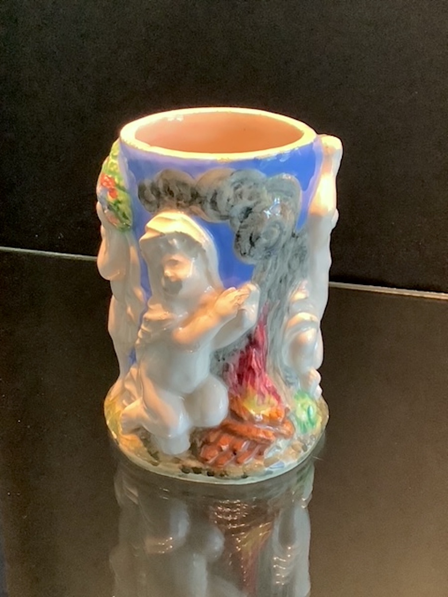 The second item is a glazed, blue ceramic vase ornamented with cherubic figures all the way around. It has an inscription on the bottom noting the date it was produced, and that’s all we know except that it has been in the family for generations. Sadly, great aunt Margaret didn’t think to label it. In 1849 the Beltons and Crouses resided in Delaware, Ontario. Was it a wedding gift? A token of love or appreciation? We’ll never know.