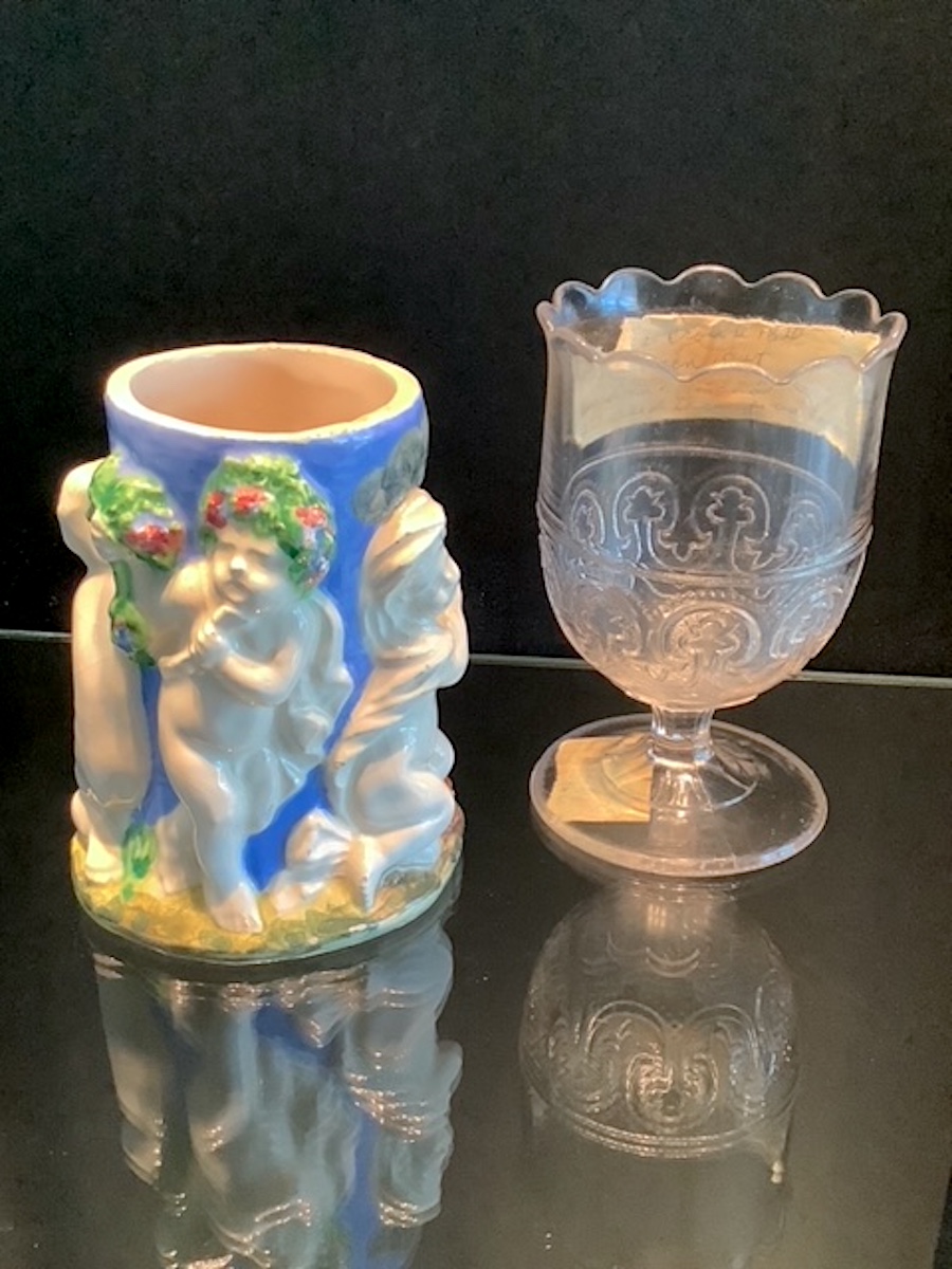 What came to mind for this piece were a couple of items my mother kept in her china cabinet for many years, given to her many, many moons ago by her great aunt Margaret (Belton) Cox (1887-1978). They now reside with our cousin, Kelly McDonall (another family historian), upon whom my mother bestowed them about a decade ago when it was time to pass them on.