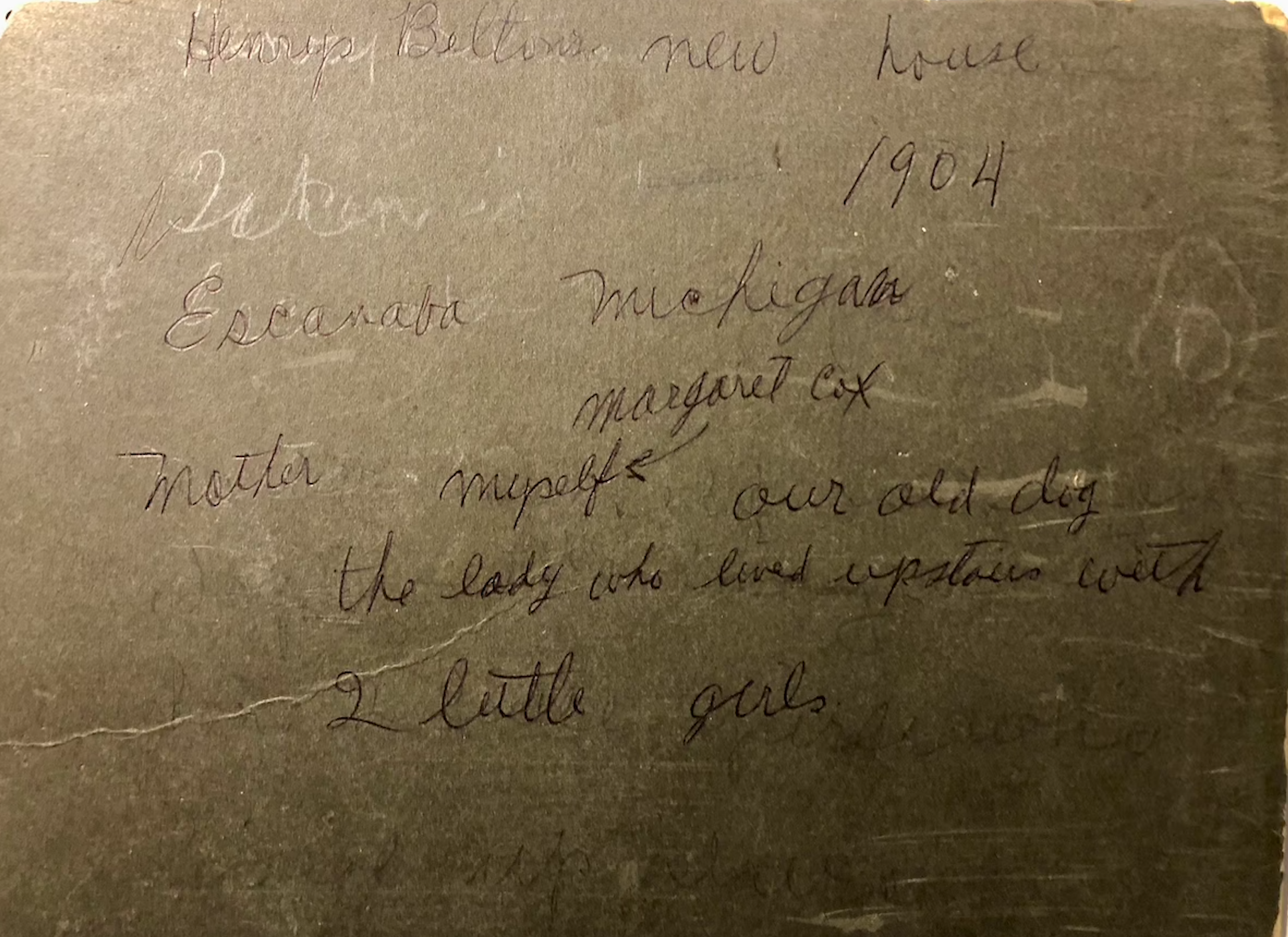 While sifting through our limited collection of images (did I mention that my great grandmother Mary Lewis Belton (1881-1966) burned most of them in the belief that no one in the future would care?) this one of my second great grandfather Henry Belton’s new house in Escanaba, MI stood out. Fortunately, aunt Margaret (Belton) Cox, his youngest daughter, thought to write on the back of it a few sparse details.